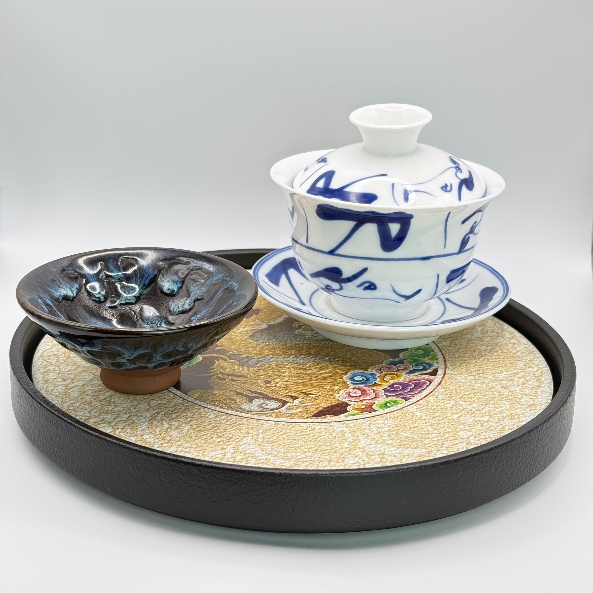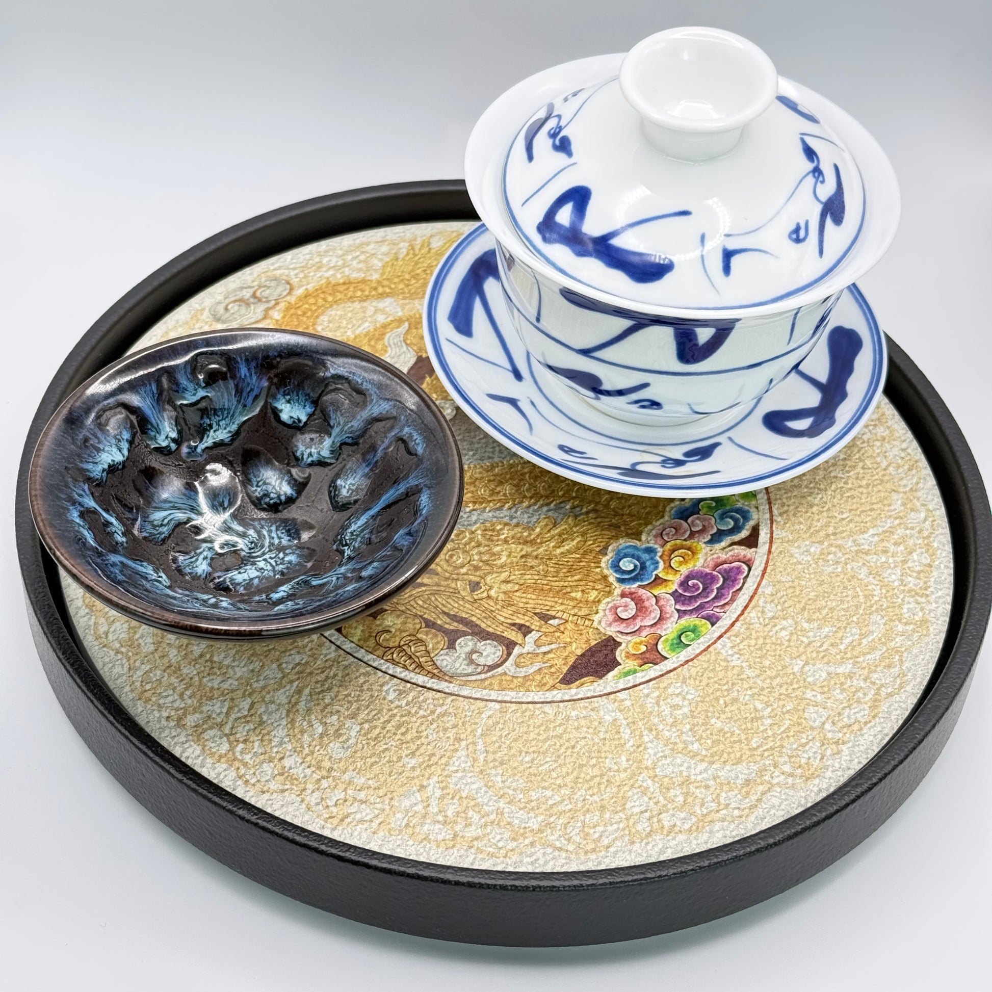 Der runde Keramik-Teetisch „Chaye“ vereint traditionelle chinesische Symbolik mit innovativer Materialtechnik für dein tägliches Teeritual. Mit einem Durchmesser von 22 cm bietet er die ideale, kompakte Basis für die Gongfu-Cha-Zubereitung, selbst auf begrenztem Raum. Das Zentrum des Tisches ziert ein detailreicher goldener Drache inmitten klassischer Glückswolken – ein kratzfestes Dekor, das auch bei intensiver Nutzung von schweren Tonkannen oder Gaiwans seine Brillanz behält.